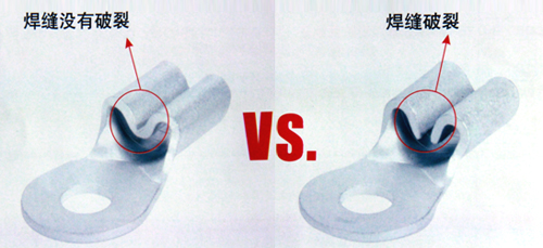 七、公司擁有精湛的焊接技術(shù),精選優(yōu)質(zhì)焊接材料,在裸端子尾部接縫處實施銀焊,生產(chǎn)出高品質(zhì)的焊接端子,確保壓著后不會產(chǎn)生破裂,及時在惡劣的使用環(huán)境下,仍能擁有強勁牢靠的拉拔力,且經(jīng)過低溫熱處理,以增強抗拉強度并確保物理性能指標。 |